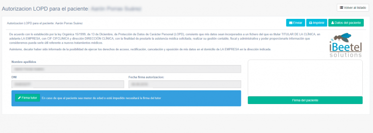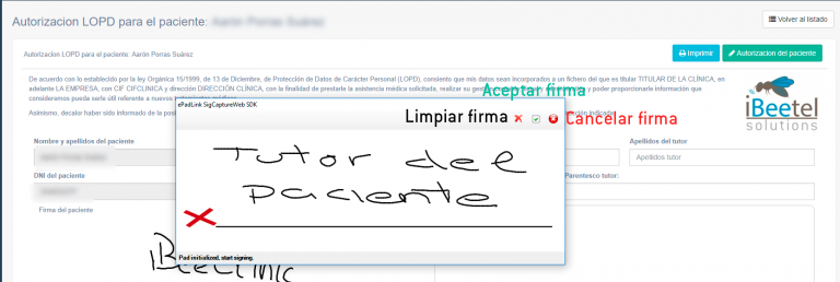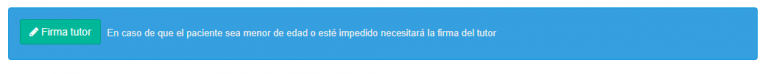 Al pulsar ese botón, se mostrará la información de la normativa que ha aceptado el paciente, además de sus datos y firma, en caso de realizarla, y un formulario donde se tendrán que rellenar los datos del tutor y realizar su firma pulsando el botón «Firma del tutor».