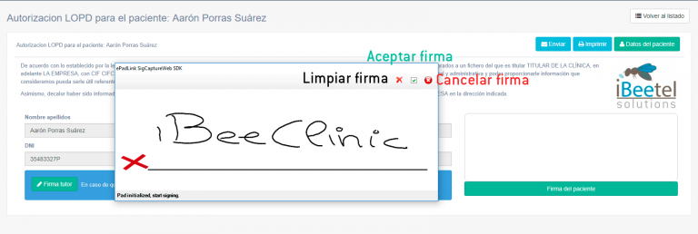 Cuando se comenzó el desarrollo se barajaron varias soluciones, pero al final nos hemos decidido por utilizar la capturadora de firmas ePadLink VP805. Hemos optado por esta solución ya que es una forma segura y legal para almacenar toda la información relativa a la firma del paciente, ya que no solamente guardamos la imagen que se genera con la firma sino que también almacenamos todos los datos biométricos que la firma del paciente genera. Estos datos en caso de ser necesarios, solamente tendrás que pedirselo al equipo de iBeeClinic y este te los proporcionará.