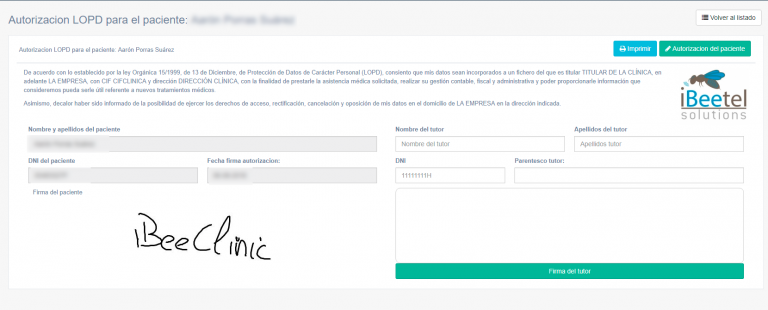 Con el objetivo de reducir la utilización de papel para almacenar el historial de los pacientes y la documentación de las clínicas y así convertirse en una clínica de fisioterapia más sostenible y eco friendly, hemos implementado un sistema de firma digital para que los pacientes pueda firmar la autorización de la RGPD en las clínicas que utilicen iBeeClinic.