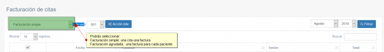 - Facturación simple: es la facturación que ya estaba. Cada cita genera una factura.